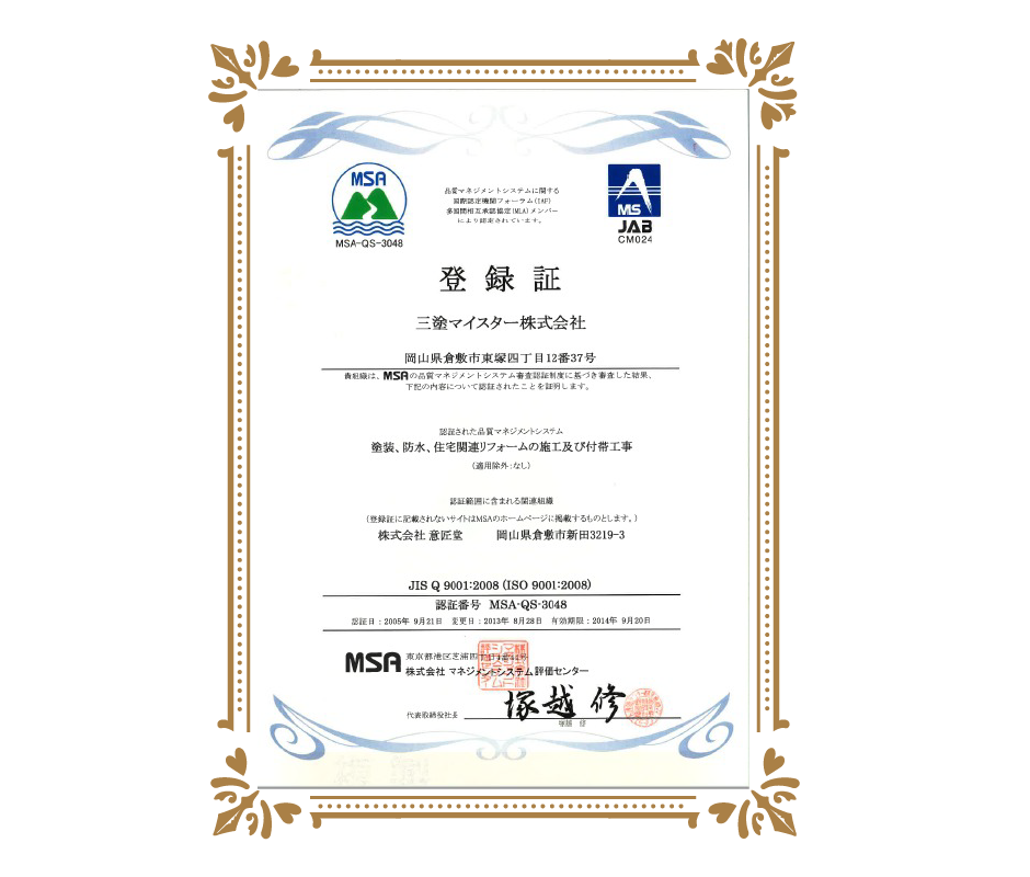- ISO品質管理システムにより、各工種ごとに品質マニュアルを作成し、全ての事柄の記録と周知を徹底する環境をつくることで品質のばらつきをなくし、何時誰が担当しても同じ品質の施工を同じ価格で提供しています。