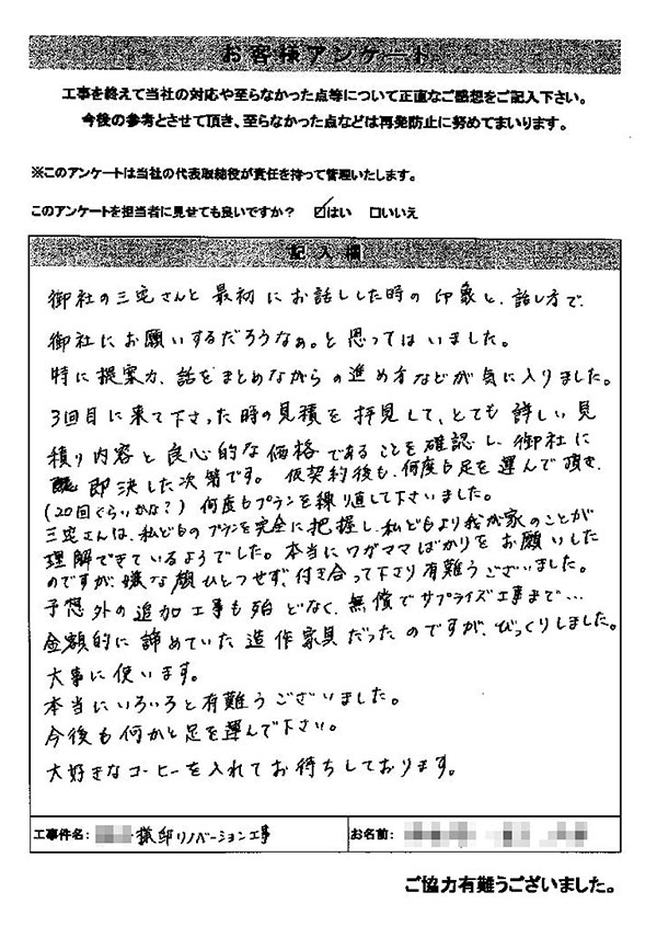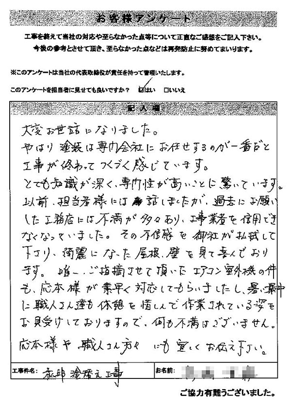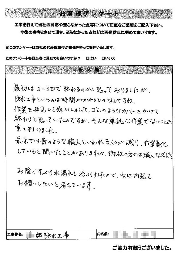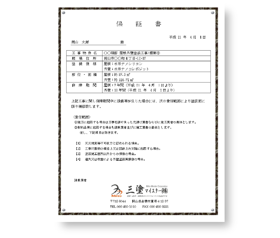 - カイシン工業では施工後もお客様にご安心頂くため、アフターメンテナンスを万全にし、お客様に安心して頂くための証拠として保証書を発行しています。