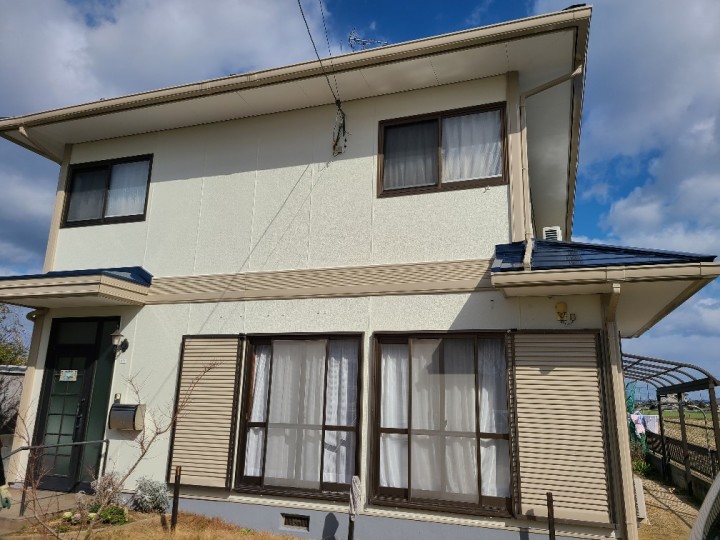 施主様よりご依頼を頂き岡山市南区のK様住宅の外壁及び屋根等の塗装/塗替え工事を行いました。今回のお客様は前回の塗替え時にも弊社にて施工さしていただいており、その際の提案・施工や対応を気に入っていただき2回目のご依頼でした。前回はシリコン樹脂での施工をさして頂いており15年ほど経過し若干のチョーキングによる色あせが見られました。今回の塗替えでは対応年数を延ばす為、日本ペイントのフッ素樹脂、ファイン4Fセラミックを使用し施工しました。塗替え色は外壁は元々のイメージを崩すことなく同系色で少し白が多めの色を使い少し明るいイメージで、屋根は元々の色よりイメージを替えネイビー系を使用することによりシャープな仕上がりとしました。